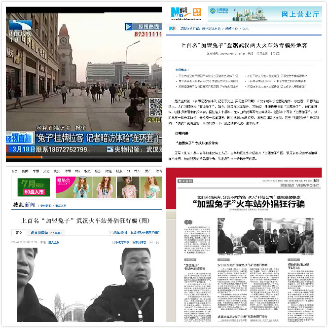 2014年以來,公司不斷接到考察客戶的投訴,稱在火車站、汽車站等地有不法分子偽裝成政府部門的工作人員,利用外地來漢客戶人生地不熟的弱點,實施騙局,甚至敲詐,3月18日武漢本地各大媒體也以各種形式報道了此種亂像,將這類人員稱為“加盟兔子”